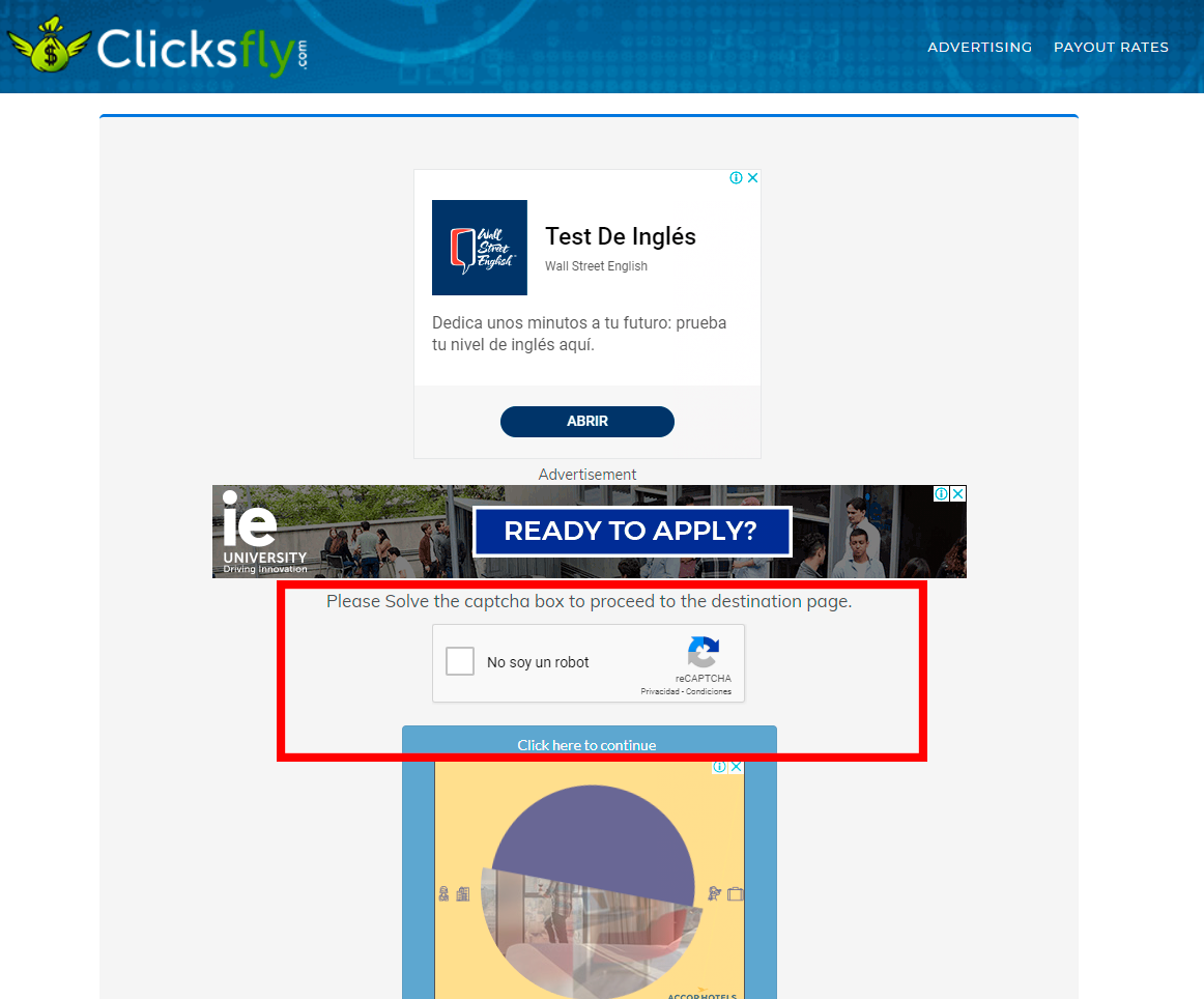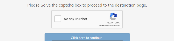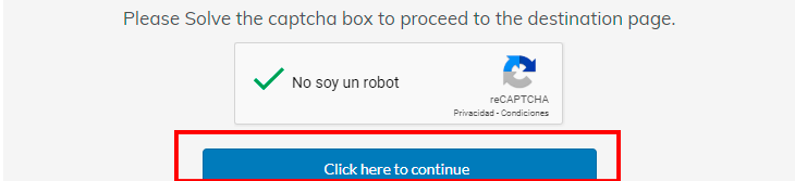 4- Tienes que tachar la casilla y resolver un «Captcha» una vez se haya verificado que no eres un robot, se desbloqueará justo debajo, un opción llamada «Click here to continue» que tendrás que clickear